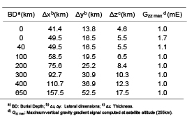 It should be noted, however, that the presented resolution tests are based on an isolated density anomaly corresponding to a prism with a fixed aspect ratio. This is not the general case in nature, where density anomalies are placed at different depths resulting in a complex superposition of individual signatures. Using different aspect ratios will modify the calculated signal, although when the anomalous mass is equivalent and the lateral dimensions are realistic, these changes are not significant. In addition, the gravity gradient will be sensitive to the inclination of the lateral sides of the anomalous body, such that a regular prism, as that considered in the resolution test, tends to maximize the signal. Finally, the high satellite altitude together with the burial depth of the density anomalies contributes to the filtered and somewhat blurred final image of the computed gravity gradient components.