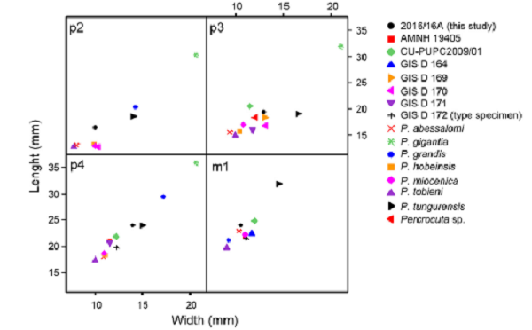 According to the measurements (Table 1), the p2 described here is longer than the p2 in specimens GSI D 169, 170, 172, but narrower than GSI D 170. Similarly, the p3 here described is longer than the p3 in GSI D 169, 170, 171, 172, and shorter than CU-PUPC 2009/01, but is wider than GSI D 171, CU-PUPC 2009/01, and narrower than GSI D 169, 170. Moreover, the p4 described here is longer and wider than the p4 in GSI D 164, 172, AMNH 19405, CU- PUPC 2009/01. The length of m1 described here is bigger than the m1 in GSI D 164, 172, AMNH 19405, and smaller than CU-PUPC 2009/01, but narrower than GSI D 164, 172, AMNH 19405, CU-PUPC 2009/01 (Fig. 3). Similarly, the p2 described here is longer than the p2 in Percrocuta abessalomi (Gabunia, 1973), Percrocuta tobieni, Percrocuta hobeiensis and Percrocuta miocenica (Ciric, 1960), shorter than in Percrocuta tungurensis (Colbert, 1939), Percrocuta grandis (Kurtén, 1957), Percrocuta gigantea (Schlosser, 1903) and Percrocuta sp. from Al Jadidah, wider than in P. abessalomi, P. tobieni, P. hobeiensis, and equal to the ones of P. miocenica, and narrower than in P. tungurensis, P. gigantea and P. grandis. The p3 described here is longer than the p3 in P. abessalomi, P. tobieni, P. hobeiensis, P. miocenica, P. tungurensis, shorter than in P. gigantea, while broader than in P. abessalomi, P. tobieni, P. hobeiensis, P. miocenica and Percrocuta sp. from Al Jadidah, and narrower than P. tungurensis and P. gigantea. The p4 described here is longer than the p4 in P. abessalomi, P. tobieni, P. hobeiensis, P. miocenica, equal to the ones seen in P. tungurensis, and shorter than in P. gigantea and in P. grandis, while being wider than in P. abessalomi, P. tobieni, P. hobeiensis, P. miocenica, and narrower than in P. tungurensis, P. gigantea and P. grandis. The m1 described in this paper is longer than the m1 in P. abessalomi, P. tobieni, P. hobeiensis, P. miocenica and Percrocuta sp. from Al Jadidah, while being shorter than in P. tungurensis and P. grandis, and wider than in P. abessalomi, P. tobieni, and Percrocuta sp. from Al Jadidah, and narrower than in P. miocenica and P. tungurensis (Fig. 3).