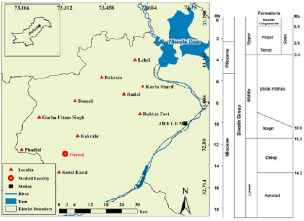 Location of the study area in the vicinity of Hasnot, in the Jhelum district, Punjab, Pakistan, with map of Pakistan (inset) and the general stratigraphic framework for the Miocene and Pliocene in the Siwaliks.
