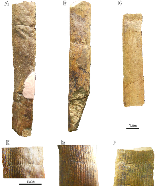 Pith casts of first-order axes of Calamites (Mesocalamites) cistiiformis from Roca Punxenta Section. A–C) General view of pith casts, D–F) details of the nodes showing both the continuous and alternating ribs along the nodal line. A, D) Specimen MGB 77559; B, E) Specimen MGB 77558; C, F) Specimen MGB 775561.