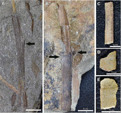 The other type of taphofacies corresponds to adpressed axes found on top of the sandstone beds. These remains, left on sand deposits after the turbidity flow ceased, were not filled in with sediment, thus hindering the formation of pith casts. They were completely flattened during the early burial and show parallel orientation.