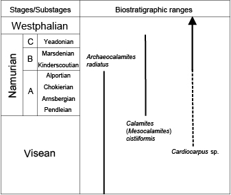 The Carboniferous biostratigraphy of plant macro-remains is based mainly on assemblages consisting of fern and pteridosperm foliage and lycopsid bark, e.g. the classical biozonations of Wagner (1984) and Cleal (1991). Sphenopsids have been usually considered less precise biostratigraphic indicators, given their wide chronostratigraphic ranges. Nevertheless, this plant group shows a relatively well-known chronostratigraphic succession of morphologies that remains consistent over large biogeographic areas and is extremely useful when other fossils are absent due to taphonomic factors. Although a formal biozonation based on these fossils has not been proposed yet, the succession of the sphenophyte species has been used by some authors, such as Josten (1983), for the biostratigraphic characterisation of the Namurian. In the case of the Culm facies and similar flysch deposits, sphenopsid remains are especially useful since they can withstand long-distance transport by flotation or traction even in very distal and deep marine settings. Furthermore, they are easily fossilised as adpressions or casts, the former without further reworking. Another type of plant remains that can be easily transported and preserved as allochthonous assemblages are pteridosperm and cordaitalean seed. The combination of both axes and seeds enable a relatively reliable biostratigraphic characterisation of the Culm deposits, based on coeval, rather than reworked fossils.