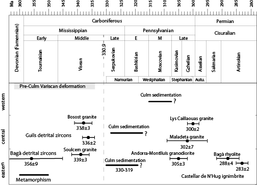 Chronostratigraphic evidence for the Variscan shortening event in the Pyrenees is scarce. In low-grade metamorphic domains, data may be provided by the synorogenic Carboniferous deposits, which generally developed in turbidite or flysch basins and are known regionally as the Culm facies. However, the age of these deposits is difficult to ascertain. It has been estimated mainly using biostratigraphic data of conodonts from older rocks corresponding to limestones underlying the Culm deposits and from reworked carbonate blocks and olistostromes occurring within Culm conglomerates in other areas of the Pyrenees and Montagne Noire (Engel and Raymond, 1983; Delvolvé and Perret, 1989; Delvolvé et al., 1998). It should be noted that these methods provide maximum ages. Recently, a maximum depositional age was also provided by the U-Pb ages of detrital zircons (Martínez et al., 2015). A minimum age was provided by the dating of crosscutting granites (Romer and Soler, 1995; Maurel et al., 2004; Pereira et al., 2014). In medium- to high-grade metamorphic areas, the geochronological ages of regional metamorphism or intrusive magmatic bodies constrain the age of the main Variscan deformation structures. This method also provides a minimum age, as the main Variscan structures predate both thermal events.