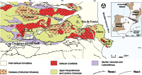 The pre-Variscan rocks of the Pyrenees are involved in the Alpine lower thrust sheets and crop out extensively along the backbone of the mountain chain (Fig. 1). These rocks form an elongated strip, unconformably overlaid by Mesozoic and Cenozoic rocks that are not continuous with the neighbouring outcrops of the Catalan Coastal Range to the South or the Mouthoumet, Montagne Noire and French Central massifs to the North (Fig. 1). In the eastern Pyrenees, a complete pre-Variscan succession ranging in age from the Ediacaran to the late Mississippian/early Pennsylvanian can be identified.