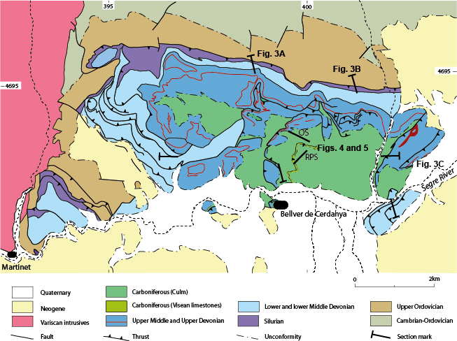 Ediacaran to Lower Ordovician rocks constitute a thick (3,000 meters) sequence of metasedimentary rocks, with gneissic bodies, and layers of marbles, quartzites and calc-silicates interbedded in its lower part. A well-dated Upper Ordovician succession (Cavet, 1957; Hartevelt, 1970) lies unconformably over the sequence (Santanach, 1972; García-Sansegundo and Alonso, 1989; Casas and Fernández, 2007). Although it is difficult to evaluate the magnitude of this unconformity, it can be assumed that there was considerable erosion before the Upper Ordovician deposition. During the Silurian, black shales were deposited, which grade upwards to an alternation of black limestone and black shales. The Devonian is represented by a limestone sequence with common facies and changes in thickness along the chain. In the study area, Sanz-López (2002, 2004) identified a complete succession from the Lochkovian to the Famennian. The upper part of the Devonian succession consists of characteristic nodular limestone widely occurring throughout the Pyrenees. It should be noted that the first Carboniferous conodonts can be recorded on the uppermost part of these limestones (Sanz-López, 2002). Black radiolarian, chert and shales from the Tournaisian lie above the nodular limestone and are, in turn, overlain by an intercalation of chert with nodular to massive limestones of the Aspe-Brousset Formation (Fm.), that housed the conodonts from the Upper Tournaisian to Lower Serpukhovian. Siliciclastic rocks corresponding to the Culm facies, formally defined as Bellver Fm. in the study area (Brouwer in Hartevelt, 1970), overlie unconformably the Aspe-Brousset Fm. (Delvolvé et al., 1998; Sanz-López, 2002, 2004). The age of the Culm deposits is based on scarce fossils and varies along the Pyrenees (Delvolvé and Perret, 1989), although a Late Visean–Early Namurian (Serpukhovian) age for the Culm deposits in the eastern and central Pyrenees is accepted by most authors (Cygan et al., 1981; Engel and Raymond, 1983; Delvolvé et al., 1993; Delvolvé et al., 1998; see Discussion in Sanz-López, 2002).