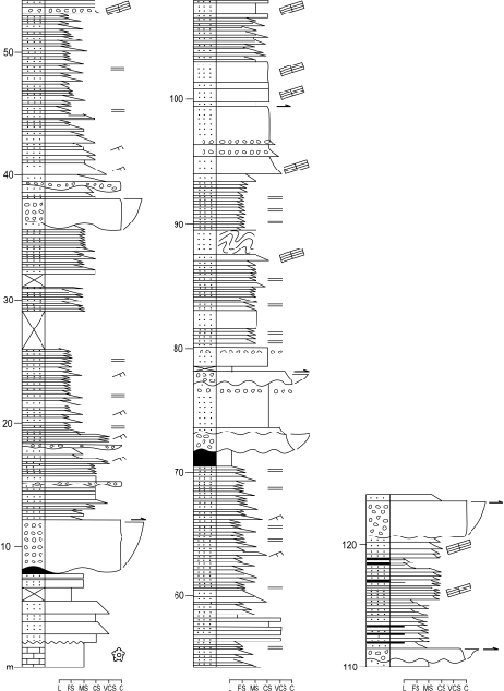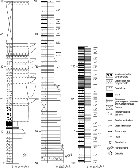 This section unconformably overlies pre-orogenic Visean limestone (Aspe-Brousset Fm.) and chert. The section contains a number of thinning- and fining-upward sequences, each up to 30m-thick, identical in facies and vertical evolution (Fig. 5). They begin with 1–4m-thick clast-supported conglomerate organised in beds 0.5–2m-thick. These beds are massive and show a lenticular shape, an erosive base and a flat top. The clasts are up to 10cm in diameter and mainly composed of white hydrothermal quartz (rounded) and black chert (angular), rarely of granite or schist, being limestone absent. They correspond to A1 facies of Mutti and Ricci Lucchi (1972) and Walker and Mutti (1973). The basal conglomerate in each sequence is usually overlain by medium- to coarse-grained sandstone intervals, several meters-thick, organised in tabular beds ranging from a few decimeters to 4 meters in thickness. Most of these sandstones are massive, showing a microconglomeratic lag deposit, and some contain abundant woody axes, providing the plant material studied herein. On top of the sandstone interval, some of the sequences display an interval of fine sandstones grading to finely-laminated grey shales (Bouma sequences Tabc and Tabcd). These sequences become increasingly enriched in finer deposits upward in the section.