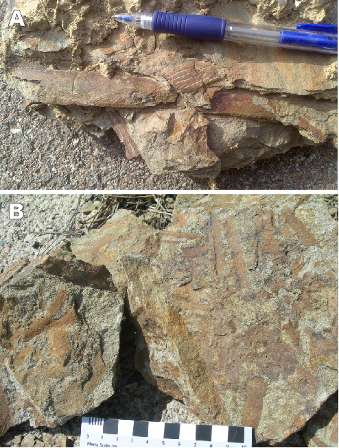 Plant taphofacies found in the turbiditic deposits (Culm facies) of Bellver Formation. A) Plant taphofacies of tridimensionally preserved axes (internal casts) within the turbiditic sandstone. B) Plant taphofacies formed by adpressed axes at top of a turbiditic sandstone.