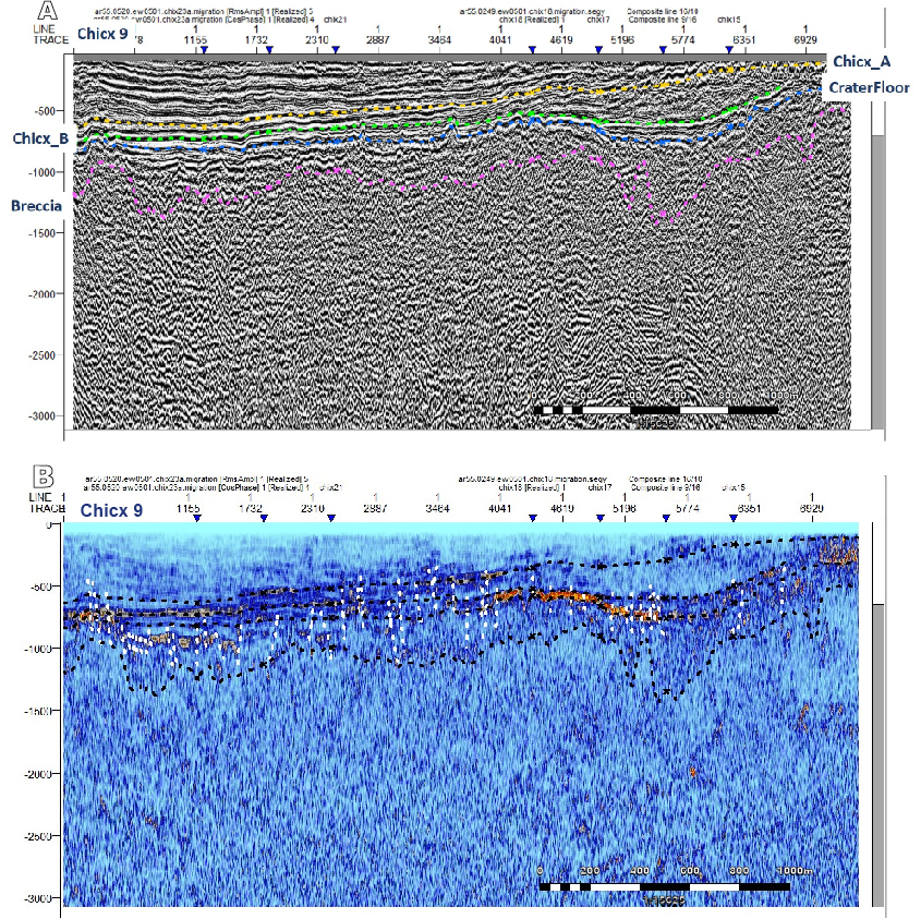 Data integration in surface maps and 3-D cubes for the survey grid permitted to follow selected marker reflectors and to define the stratigraphic packages. Seismic attribute analysis allowed characterization of the carbonate sediments and impactites. Use of the cosine of phase and RMS attributes improved the definition of lateral continuity and the petrophysical characterization of seismic packages. The basal carbonates of Chicx_A units and upper breccia units are marked in the seismic attributes, showing the contrasts in petrophysical properties between the impactites and the carbonate sediments. The Chicx_A basal carbonates showed distinct petrophysical properties in the RMS attribute, which allowed higher definition in the stratigraphic analysis.