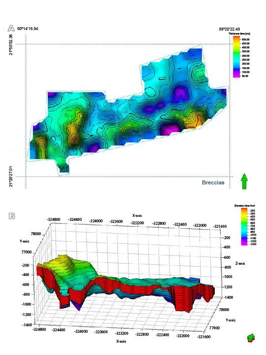 A) Isopach map illustrating the thickness of the breccia, between the breccia lower contact (pink) and crater floor (blue) horizons. B) 3-D oblique view of the upper breccia unit. Arrow on the side points to the North.