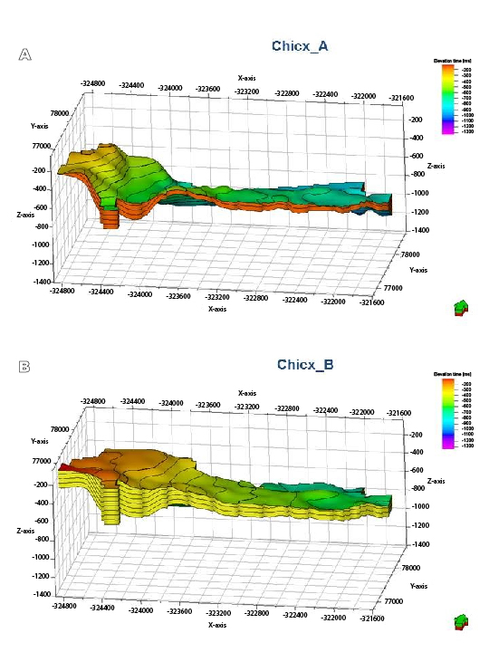 A) 3-D integrated oblique view from the South. B) 3-D integrated oblique view from the North. As already represented in Figures 10 and 11, the upper thicker (yellow) layer corresponds to Chicx_A, the thinner (orange) layer below this corresponds to Chicx_B, and the lower thick (red) layer are the Breccia.