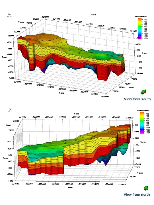 Results are presented in terms of surface contour maps for the marker reflectors in Figures 6 and 7. At travel times ranging between -500ms and -1300ms in the West-East direction, the pink reflector delimits the top of a package of discontinuous reflectors, interpreted as fractured or reworked materials (Fig. 6B). A fractured brecciated unit is a likely explanation for the pattern of discontinuous reflectors. Working upwards, a blue reflector is identified, with its travel times ranging between -450ms and -1000ms in a West-East direction (Fig. 7B; 6A). This reflector was chosen as the first relatively continuous present in every profile. Broken discontinuous reflectors of high amplitude can be observed below the blue reflector, but more continuous than those observed at greater depths in the fractured brecciated unit. Fractures or sedimentary discontinuities are therefore interpreted in the package located between the pink and blue horizons (Fig. 5A; B).