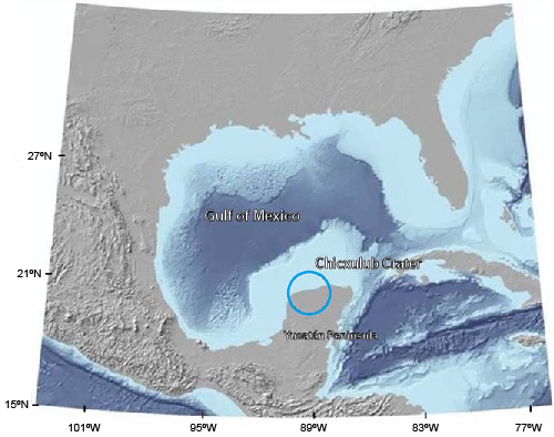 Map of Gulf of Mexico showing the location of the Chicxulub impact crater in the Yucatán Peninsula, modified from French and Schenk (2004).