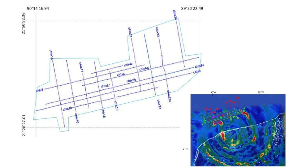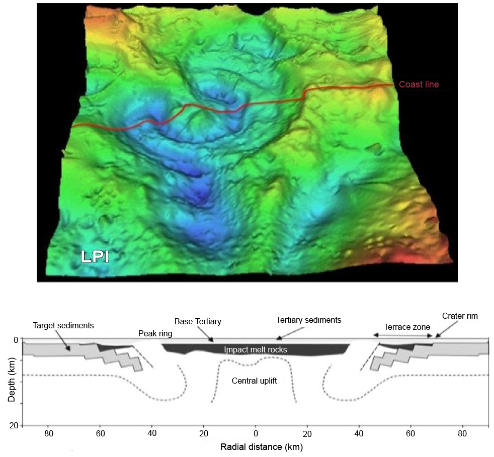 Penfield and Camargo-Zanoguera (1981) used combined analysis of gravimetric and aeromagnetic data and borehole logs to interpret the geophysical and borehole information, with the occurrence of the “andesitic igneous zone” as a possible impact crater. Successive studies confirmed the impact origin and K/Pg age of Chicxulub (Hildebrand et al., 1991, 1998; Sharpton et al., 1992, 1993; Urrutia-Fucugauchi et al., 1996, 2011). Analyses of potential field anomalies and seismic reflection profiles reveled a central structure characterized by a peak ring and central uplift with concentric internal and external rings (Sharpton et al., 1993; Connors et al., 1996; Morgan et al., 1997; Hildebrand et al., 1998 ; Vermeesch and Morgan, 2008). Since the 1990’s, the Chicxulub Crater has received renewed attention from the scientific community interested in the mass extinction and K/Pg boundary events. The effects of the impact on the climate and life support systems have been considered the major cause of the end Cretaceous extinction (Alvarez et al., 1980; Schulte et al., 2010).