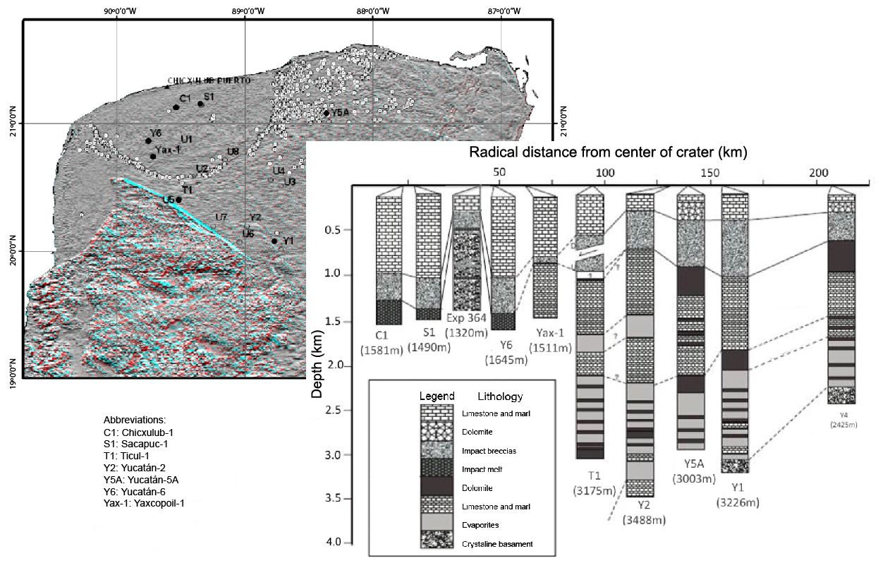 The UNAM exploration wells sampled the post-impact carbonate sequence and impact breccias. Boreholes Santa Elena (U5), Peto (U6) and Tekax (U7) cored the carbonate-breccia contact and the impactites, an upper breccia unit rich in melt and basement clasts and a lower breccia unit rich in carbonate clasts (Urrutia-Fucugauchi et al., 1996, 2011). The stratigraphy of two inverted breccia sequence resembles the suevitic and Bunte breccia units documented in the Ries Crater.