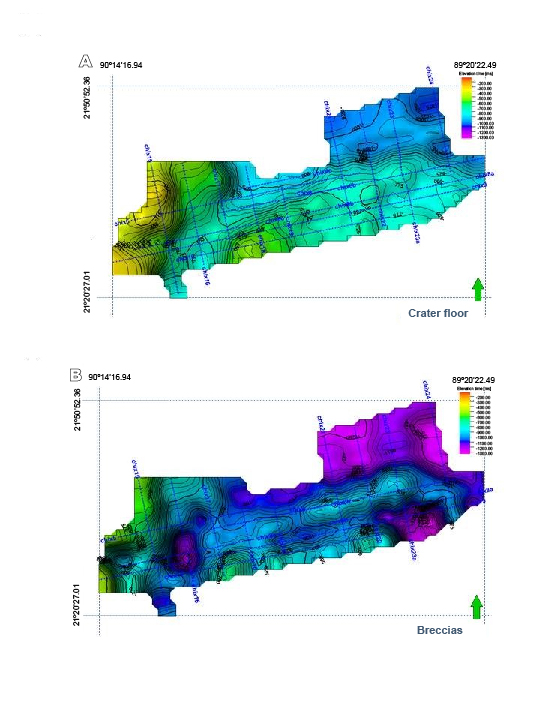 The impact breccias are characterized as fragmented materials beneath the crater floor; the upper breccia package shows lateral variation in thickness with large differences between the central and northern sectors. The reflector interpreted as the base of the breccia package varies from -500m to -1300m (Fig. 6A). In the seismic lines, packages of discontinuous reflectors characterize the fractured breccia unit. The bottom reflector limiting the upper breccia unit might represent the contact with top of the melt rock unit, which appears limited to the peak ring zone (Barton et al., 2010).