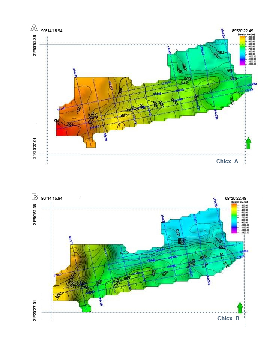 Surface contour maps for the post-impact Paleogene carbonate packages. A) Seismic package Chicx_A. B) Seismic package Chicx_B.