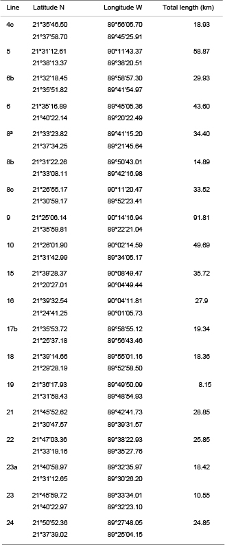 We analyze 14 seismic lines of the Chicxulub Seismic Experiment in the central sector (Fig. 4), three of which are segmented in seven lines, summing up to a total of 19 seismic lines. Information on location, coordinates and length of seismic lines is summarized in Table 1. A total of 1822km of seismic reflection lines were acquired, including the central grid of high resolution profiles, which contains the 19 lines of this study, a semi-circular profile and three radial profiles (Gulick et al., 2008). The R/V Maurice Ewing of the University of Columbia, equipped with a multichannel system with 6km streamer, and additionally, 28 ocean-bottom seismometers and 87 land seismometers were used for data acquisition in the project.