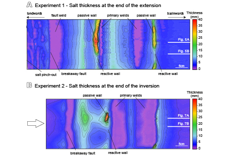 The comparison between Experiments 2 and 3 (Figs. 7A–8A; 7B–8B) shows that in addition to the structural architecture inherited from the extensional episode, the syn-kinematic sedimentation plays a key role in strain localization and the evolution of salt structures during inversion. Furthermore, it is also critical to the timing of contractional structures.