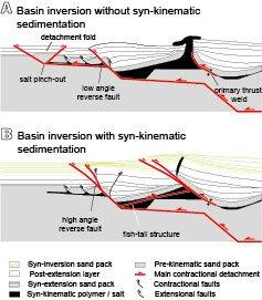 v) Syn-kinematic sedimentation during inversion is a key factor controlling where, when, and how the strain is localized, and it therefore controls the evolution of inherited salt structures. While salt pinch-outs usually serve as nucleation points, syn-kinematic sedimentation during inversion inhibits the propagation of the contractional deformation towards the pinch-out. In that case, the thrust front is translated backwards and is characterized by high angle reverse faults. For instance, syn-kinematic sedimentation during inversion also seals the thrust front and therefore forces contractional deformation to switch further backwards, where pre-existing salt structures can absorb the main shortening. Meanwhile, salt layers and primary thrust welds act as contractional detachments and also transfer deformation towards these inherited diapirs until the development of secondary welds and thrust welds.