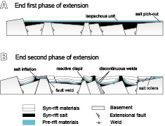 The asymmetrical sinking of the salt-detached basin infers the timing of welding. Welding kinematics can be also noticed by basin rotations and by the depocenter’s trajectory variations in syn-extension sediments.