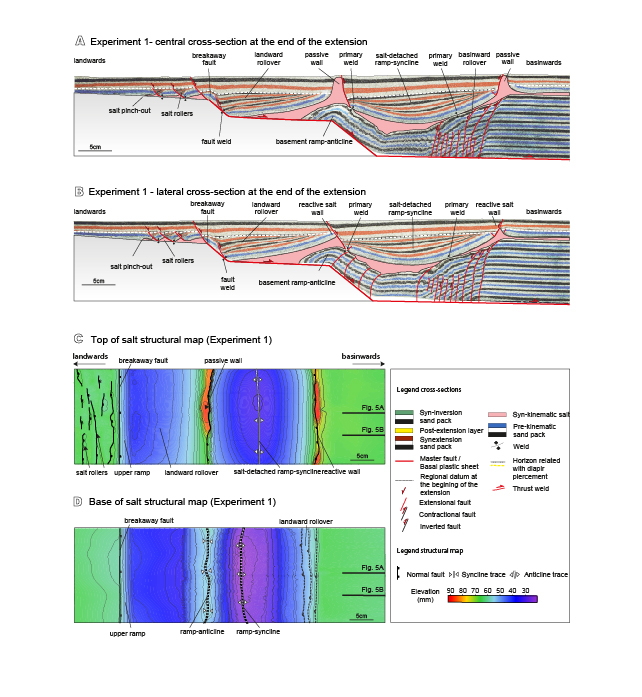This contribution is part of a wider experimental program including 5 different experiments (Table 1) and they complement the recent work of Roma et al. (2018) which characterized the kinematics of salt-detached ramp-syncline basins during extension and subsequent inversion. Here, we have selected three end-member experiments to illustrate the evolution of salt structures during extension and inversion, paying special attention to the role of syn-kinematic sedimentation.