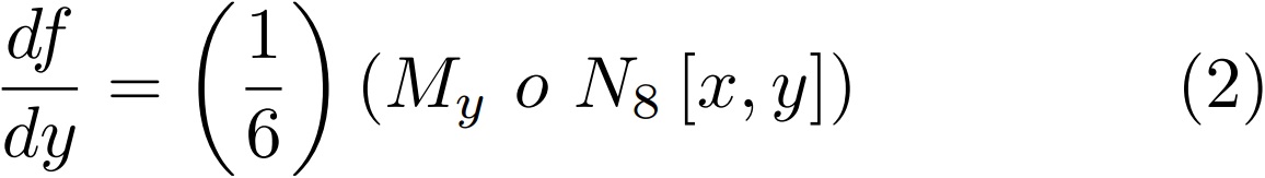 La máscara M sobre una imagen N, la máscara de Sobel es una matriz 3 x 3, la cual tiene un centro estimado que es el doble del valor del pixel vecino, existe una máscara Mx y una máscara My [17] como se puede ver en la Figura 3.