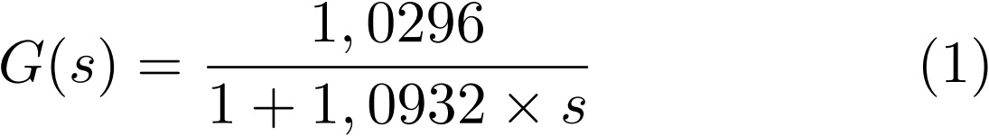 Los datos con que se obtiene la función de transferencia aparecen mediante la medición de las revoluciones por minuto que se obtiene al aplicar voltaje a un variador de frecuencia que controla la velocidad de giro del primotor el cual mueve al generador, manteniendo la tensión de excitación constante. Realizando una variación de tipo escalón al voltaje aplicado se obtiene datos mediante LabView de las revoluciones por minuto los cuales son procesados mediante el comando «ident» en Matlab, obteniendo la siguiente ecuación: