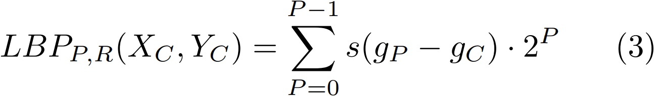 In the equation , gP is the value of the central pixel, gC the value of the neighbors and 2P is the weight stablished for each operation. And s(gP −gC) is given by:
