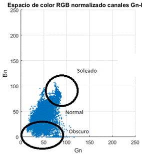 La segmentación se realiza discriminando el color rojo del fondo, es decir, del resto de colores. Experimentalmente se ha elegido el espacio de color RGB normalizado (RGBN) porque presenta una distribución más compacta en los canales Bn y Gn, cuyos valores se encuentran en los intervalos [20;90] y [0;90] respectivamente. LaFigura 2(a) muestra la distribución del color rojo en función de las condiciones de iluminación, normal, soleado y oscuro. Figura 2(b) muestran las distribuciones de las clases, donde el rojo representa la clase de interés y el azul identifica la clase de no interés.