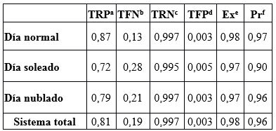 Estos resultados son los valores promedios del procesamiento de 37185 imágenes de tamaño 640x480 píxeles, distribuidos de la siguiente manera: 9999 en soleado, 14744 en normal y 12442 en nublado.