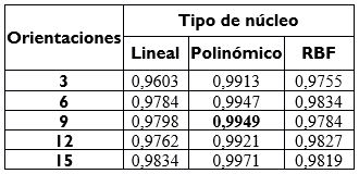 2) Para el caso de la clasificación, los mejores parámetros del descriptor HOG son celdas de 8x8 píxeles, bloques de 2x2 celdas con solapamiento simple, 9 orientaciones sin signo y SVM polinomial de parámetros C=215, r=0, d=3, y=1/m, con m es el tamaño del vector de características. En la Tabla 6 se presentan los resultados para el caso de 8x8 píxeles, donde el mejor resultado se encuentra resaltado en negrilla.