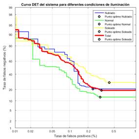 Para medir el poder de detección, la curva de la tasa de falsos negativos (taza de pérdida) versus la tasa de falsos positivos, en escala logarítmica en el rango de 0.01-1m [35], se presenta en la Figura 6, en ella se observa que el mejor desempeño se realiza en días normales con una tasa de pérdidas del 13 % y la peor ejecución es en días soleados con una taza de pérdidas del 28 %.