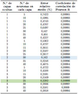 Precisamente, se selecciona la topología más adecuada de la RNA ensayando diferentes configuraciones al variar el número de capas ocultas de una a tres y el número de neuronas dentro de cada capa oculta de 5 a 40 con incrementos de 5.
