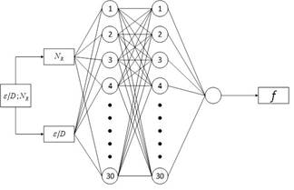 No se pueden dar reglas concretas para determinar el número de capas ocultas y el número de neuronas ocultas que debe tener una red para resolver un problema específico; el tamaño de las capas, tanto de entrada como de salida, suele estar determinado por la naturaleza de la aplicación [7–8]. Así, la problemática de la presente investigación sugiere que el número de Reynolds y la rugosidad relativa sean las dos entradas aplicadas en la primera capa y el factor de fricción, que es la salida, sea considera en la última capa de la red.