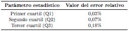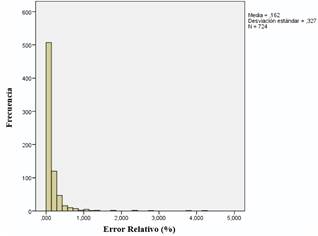 Mediante el software IBM SPSS Statistics 22® se realiza un análisis descriptivo de la variable error relativo para los 724 datos de la arquitectura seleccionada. El histograma de la Figura 3 representa las distribuciones de frecuencias. Se obtiene que la media es 0,1620 %, el error relativo mínimo es de 0 % y el máximo es de 4,2590 %.