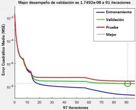 El proceso de entrenamiento se detuvo en 91 iteraciones, alcanzando un MSE de 1,7492E-8 que indica la capacidad de generalización de la RNA propuesta.