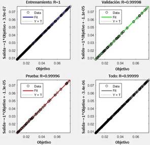El rendimiento de los conjuntos de datos de entrenamiento, pruebas y validación en comparación con la salida deseada es mostrado en la Figura 4. La muestra destinada a la validación es usada para medir el grado de generalización de la red, deteniendo el entrenamiento cuando este ya no mejora, esto evita el sobreajuste (overfitting) [12], entendido como un pobre rendimiento del modelo para predecir nuevos valores. Se constata que el proceso de entrenamiento de la RNA con topología 2-30-30-1 es truncado en 91 iteraciones, pues es cuando se obtiene el menor valor MSE de validación que es de 1,7492E-8.