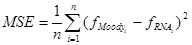 El aprendizaje de la RNA se detiene cuando el índice de error resulta aceptablemente pequeño para cada uno de los patrones aprendidos o cuando el número máximo de iteraciones del proceso ha sido alcanzado [10], [14], [15]. La función de rendimiento utilizada para entrenar la RNA es el error cuadrático medio (MSE), denotado por la Ecuación 4 [10–12]. El error relativo, reflejado aritméticamente por la Ecuación 5, es involucrado en el análisis [10–16].