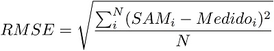 De forma gráfica, los datos in situ y los obtenidos por el modelo se muestran en la Figura 3. Se evidencia una fuerte correlación lineal respaldada en el valor del coeficiente de determinación R2 encontrado. Los valores de RMSE y NRMSE indican el grado de error que posee la estimación frente a lecturas reales, y en este caso particular son bastante aceptables [36].