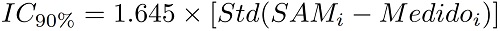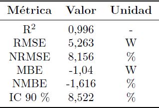 En este estudio se definen aspectos relacionados con el procesamiento de energía, por lo que, para el modelo se consideró el punto de máxima potencia del panel para cada estimación. Las pérdidas en el sistema fueron establecidas sobre la base de lecturas de eficiencia obtenidas in situ por rangos de irradiancia en intervalos de 200 W/m2 y por pérdidas debido a la acumulación de suciedad, que para efectos de cálculo se utiliza como base una pérdida de 5% establecida por defecto dentro del programa. Con los datos de rendimientos simulados, se generó una base de datos comparable con los valores medidos in situ del panel horizontal y se calcularon las métricas: Coeficientede determinación R2 (Ecuación 2), raíz del error cuadrático medio (RMSE) (Ecuación 3) y su valor normalizado, error de sesgo medio (MBE) (Ecuación 4) así como su valor normalizado; finalmente, se establece el intervalo de confianza de 90% (IC 90%) (Ecuación 5), para intervalos horarios, recomendados por algunos estudios de validación de SAM [34,35], para esta época del año. Los valores del RMSE y MBE fueron normalizados con respecto al valor máximo reportado en las mediciones in situ.