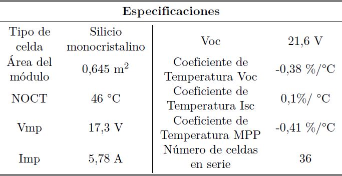 Adicionalmente, se incorporó a las especificaciones del spftware, datos técnicos de los paneles PV utilizados, los cuales son mostrados en la Tabla 3.