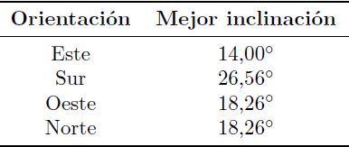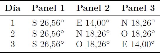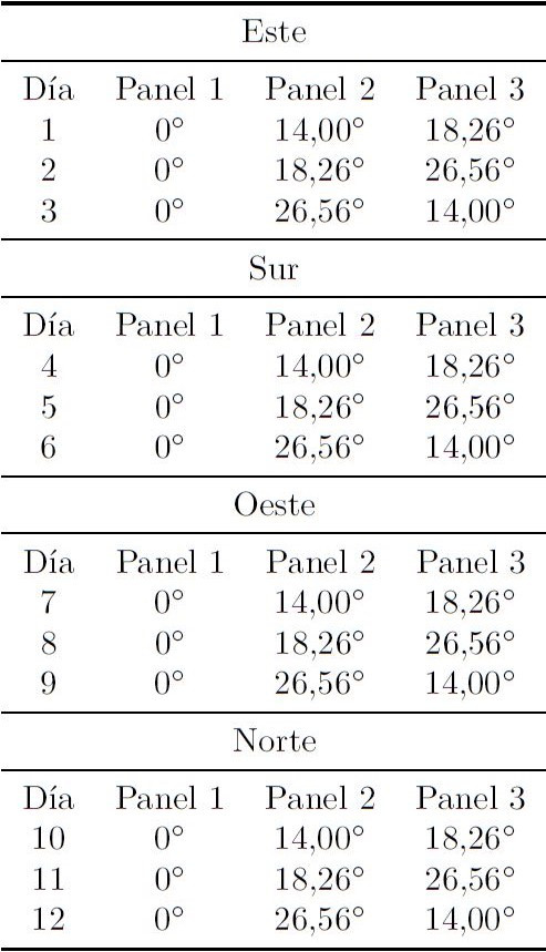 Donde η es la eficiencia de los paneles, P es la potencia de salida, E es la irradiancia del sol, y Ac es el área de captación o área del panel. De las tres inclinaciones propuestas se seleccionó la mejor de cada orientación y se realizó una medición adicional durante tres días en el mes de enero de 2017 para determinar la configuración óptima para esta época del año (tanto en inclinación y orientación), siguiendo la metodología indicada en la Tabla 2.