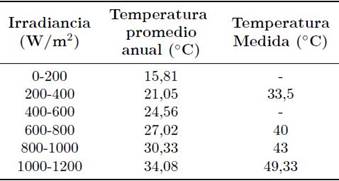 Adicionalmente, la estimación de temperatura de las celdas PV por parte del modelo difiere de las mediciones realizadas in situ. Para compararlas se empleó la temperatura promedio anual de la base de datos del modelo ya que para los mismos niveles de radiación la temperatura parece comportarse de manera similar a lo largo del año; mientras que para los datos in situ se ocuparon valores puntuales de un día de medición. Se observa una diferencia promedio importante de 13,33 °C de los datos mostrados en la Tabla 6, y las celdas sin valores denotan que, durante el día, los valores de radiación no estuvieron dentro de estos intervalos. Se asume, además, que la diferencia puede ser mayor ya que el modelo estima la temperatura de las celdas, mientras que las mediciones se las realizaron sobre el vidrio del panel que es inferior a la temperatura superficial de las celdas [40], esta variación de temperatura también puede atribuirse a la intensidad de rayos UV, por tratarse de una locación en altura [41]. Por ello, se recomendaría realizar lecturas en laboratorio para corroborar este incremento de temperatura en la superficie de las celdas