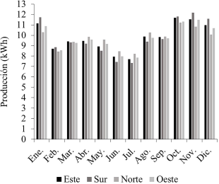 Para el caso de valores mensuales es observable una diferencia más marcada, entre 7,33 kWh/mes en el mes de julio (mes con mínima irradiación) y 12,19 kWh/mes en noviembre (máxima irradiación) respectivamente (Figura 5).