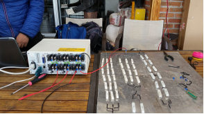 Las mediciones in situ se llevaron a cabo durante el mes de diciembre de 2016 y enero de 2017. Para ello se instalaron tres paneles PV monocristalinos junto a una estación meteorológica en la ubicación (-2,901691°S, -79,010151°E). Cada panel tiene una potencia nominal de 100 W, cuyas dimensiones son 0,54 m de ancho y 1,2 m de largo, de 36 celdas (Figura 1), conectados eléctricamente a un conjunto de resistencias empleadas como cargas que variaban entre 1 y 100 en función de la irradiancia recibida en los paneles para obtener su máxima potencia, y al equipo de medición HIOKI PW 3337-03 (Figura 2). Se procede a la toma de datos en corriente continua de voltaje, corriente y potencia en intervalos de cinco minutos, que posteriormente fueron transformados a intervalos horarios.