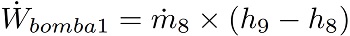 Bomba: Para calcular la energía requerida por la bomba se inicia con la fórmula que describe la potencia absorbida por una bomba, considerando el volumen específico y la diferencia de presión. Esto es igual al trabajo de la bomba como un cambio de entalpía, Ec. (12).
