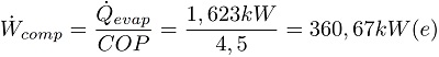 El mercado ofrece muchos tipos de máquinas que utilizan el ciclo de compresión de vapor para refrigerar. El COP promedio es 4,5 [18]. Por lo tanto, es posible calcular la potencia mecánica requerida por el compresor dada por la Ec. (16).
