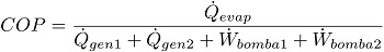 El COP de un sistema de doble etapa está dado por la relación entre el flujo de calor removido en el evaporador respecto al calor consumido en los generadores y la potencia mecánica requerida por las bombas, Ec. (2), es decir: