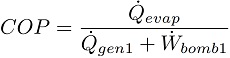 El COP de un sistema de una etapa es la relación entre el flujo de calor removido en el evaporador respecto al flujo de calor que entra al generador y a la potencia consumida por la bomba, es decir: