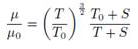Donde, la viscosidad de referencia μ0 = 1, 716 kg/(m.s), la temperatura de referencia T0 = 273, 11 K, y la temperatura efectiva S = 110, 56 K.